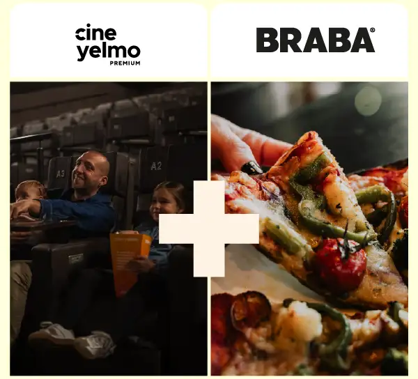 AHORRA UN 45%. Llévate dos entradas de cine en Yelmo Premium para disfrutar de la película que quieras y un 2x1 en pizza a elegir en BRABA. Podrás canjear tu plan de domingos a jueves hasta el 28/02/2026.