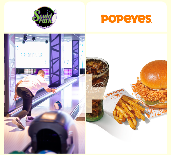AHORRA UN 40%. Llévate una partida de bolos para dos personas y un 2x1 en menú Chicken Sandwich (bebida, hamburguesa y patatas) en Popeyes. Podrás canjear tu plan hasta el 28/02/2026.
